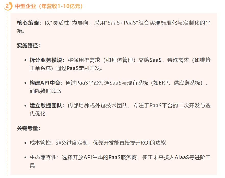 开箱即用:功能模块标准化,适合通用型需求(如CRM、ERP、进销存管理) 成本低:按需付费,初期投入小,适合中小品牌或预算有限的企业 维护简单:服务商负责系统更新和技术支持,企业可专注业务 适用场景: 需要快速实现渠道管理基础功能(如订单在线化、人员管理) 缺乏专业IT团队,希望降低运维复杂度 适配企业类型: 中小型企业(年营收<5亿):资源有限、业务模式简单,可通过SaaS快速实现基础数字化 初创品牌:轻资产运营,需低成本试错,SaaS的订阅模式可灵活调整 传统行业(如食品饮料、日化):标准化流程多,无需深度定制 客户案例: 某食品饮料企业通过SaaS实现“五个在线化”(人员、客户、订单、库存、费用),3个月内业务员人均管理终端数从80家提升至150家,促销费用核销时间由两个月变成两天,经销商协同效率提升200%。 PaaS:灵活定制的 “开发平台” 核心定义: PaaS(Platform as a Service)提供云端开发平台,企业可基于平台定制个性化功能,满足复杂业务需求。 特点: 高度灵活:支持二次开发,适配企业特有流程(如个性化促销策略) 技术门槛较高:需具备一定开发能力或与第三方合作 性价比高:比完全自研系统成本更低,比SaaS更贴近业务需求 适用场景: 业务模式复杂,标准化工具无法满足(如多层级经销商管理) 需与现有系统(如ERP、供应链平台)深度集成 适配企业类型: 中大型企业(年营收>10亿):业务链条长、需多系统协同,PaaS可构建一体化平台。 行业龙头(如建材、家电):渠道层级复杂,需定制分佣规则、促销策略等。 高速扩张期品牌:业务快速迭代,需灵活调整数字化工具。 客户案例: 某门业客户曾定制设备报修系统,但因主数据未打通,业代需手动录入客户及冰柜信息(平均耗时15分钟/单,错误率至高30%),且维修状态无法实时同步。通过PaaS平台集成CRM、资产管理系统,实现扫码自动填充信息,工单流转效率提升80%,错误率降至2%。 AIaaS:智能赋能的