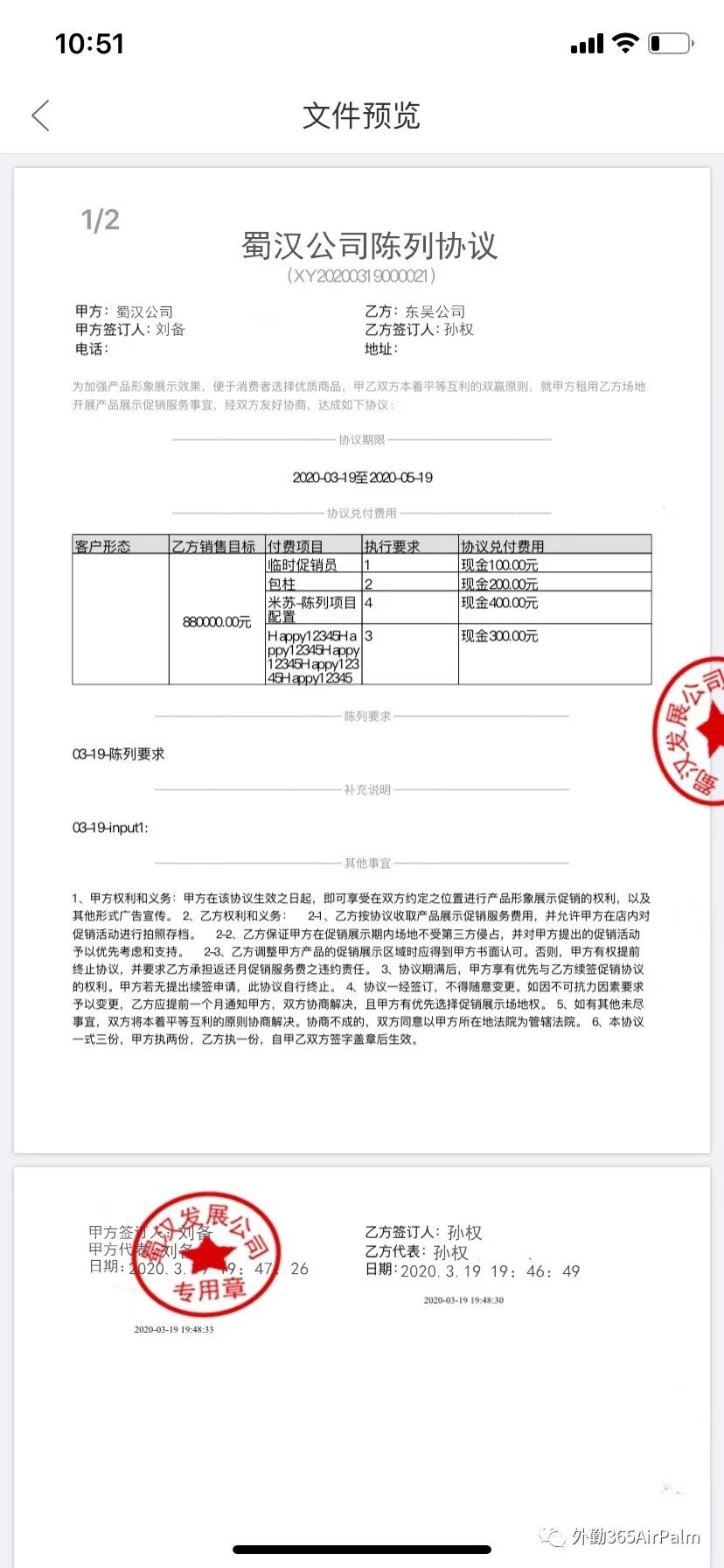 2019年10月,安徽芜湖。 xx源的销售主管李先生接到业务员张某的电话,说有三家超市与一家KA大卖场一起同意要办付费陈列协议。 协议规定,超市进货200箱后,将在六排货架上的第三层,陈列xx源的主品牌饮料8瓶,及新品饮料6瓶。陈列时间为2019年10月15日至2020年4月15日。 协议期间,超市不得随意更改xx源饮料的陈列位置与方式,xx源须每月支付超市300元的陈列费用与两箱xx源新品饮料作为酬劳。 三个月后,李先生发现,该付费协议中、业务员张某所上报的一家KA大卖场属实,但是另外三家超市中有一家超市根本就不存在,另外一家超市陈列数量和费用与合同不符,为阴阳合同,而负责该付费协议的张某已于半个月前离职。 图 01 虚假陈列,反映出业务员自身的诚信度问题,可以通过法律手段进行索赔;但虚假陈列对企业促销政策的执行与市场抢占所造成的后果却难以挽回。 企业的促销政策执行不下去,执行效果大打折扣;与竞品争夺市场时失去先机,新品上市错失机会。虚假的门店,虚假的协议,虚假的市场活动,对企业而言,所造成的不仅仅是市场费用的损失,更是销量的停滞与业务的停摆。 消费品企业该如何防范,才能将自己的市场费用花到实处? 图2 如果,当初消费品企业在业务员申请付费陈列协议时,不仅能对业务员进行验证,也能对终端门店进行验证,是不是就能避免以上情况? 每一个品牌商,都希望在合同签署过程中,对所涉及的所有角色进行多要素的实名认证,采集姓名、身份证、电话号码,终端店主在签署协议时,通过企业工商注册号、企业名称、法人姓名、法人手机号等信息验证身份,即可核对合同真实性。 这样,品牌商不仅能把每一笔市场经费花到实处,还能确保促销政策的执行,对市场份额的抢占。 图 03 现在,勤策(原外勤365)推出的电子合同服务,就能满足品牌商的这项需求,而且省下的纸质打印、盖章、往返邮寄费用,每份合同都能节约十几元成本。 以国内某知名方便面企业为例,其辖管经销商共1500家,假设每家经销商一年只与10家终端门店达成付费协议,业务员上报合同,邮寄给公司,公司盖章之后再邮寄回去,将纸质打印、盖章、两次邮寄的成本控制在12元以内,一年的费用即: 1500 x 10 x 12= 18万。 图4 使用勤策(原外勤365)的电子合同功能,将所有的付费协议从线下转到线上。 使得所有的签名环节均由实名信息认证,确保合同真实性,又节省了每一笔合同开支,并且保障了所有促销政策能深入贯彻市场,维护企业利益。